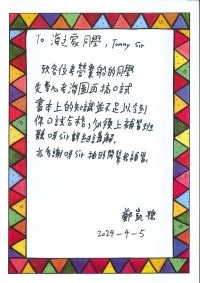 本人梁十九很多謝海之家能夠幫助我完成二級營業牌照,我是一個不識字的人,經過屢敗屢戰,不放棄的精神,所以能夠取得這個二級營業船長牌。特此希望所有學生不要放棄,只要不放棄,終有一天會考到!因為本人十九是不懂寫字及看字的人,特此叫海之家職員代筆,能寫出本人的心聲。在此謝謝Tommy