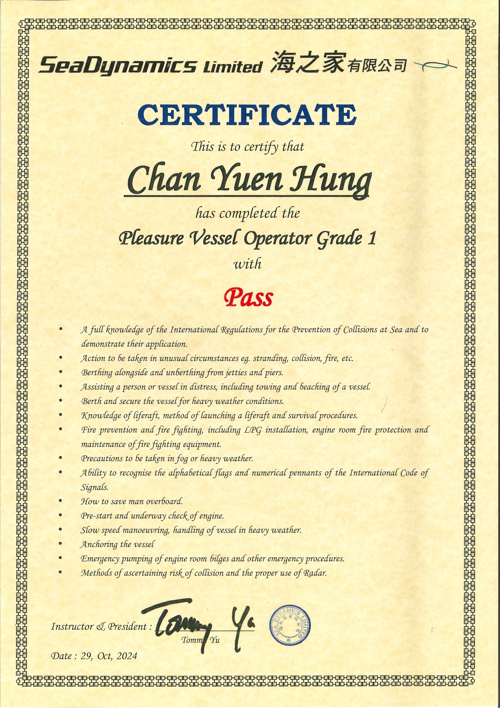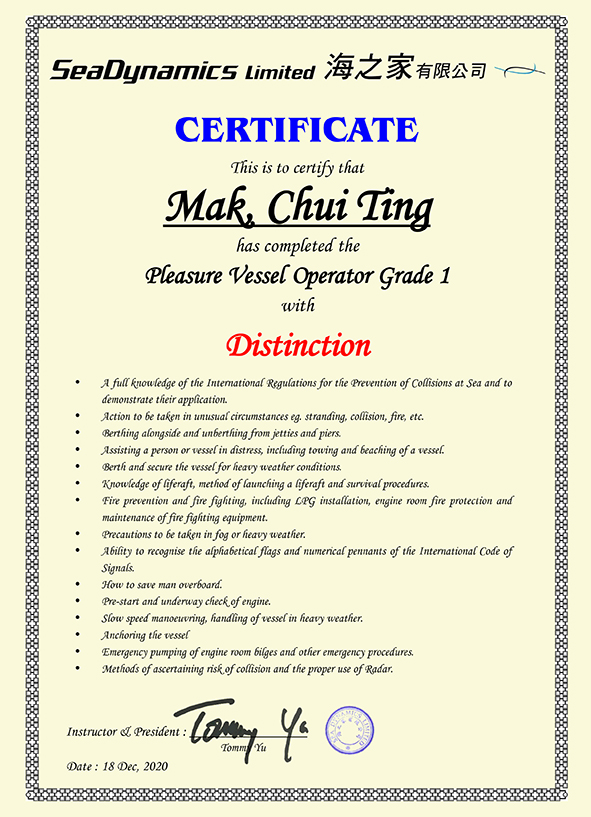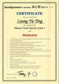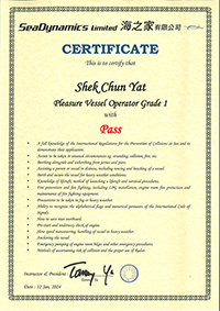 | 黃頌恆先生生生................. 一級操作人學生 - 可駕駛無限長度及無限馬力遊艇 | ||||||
