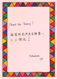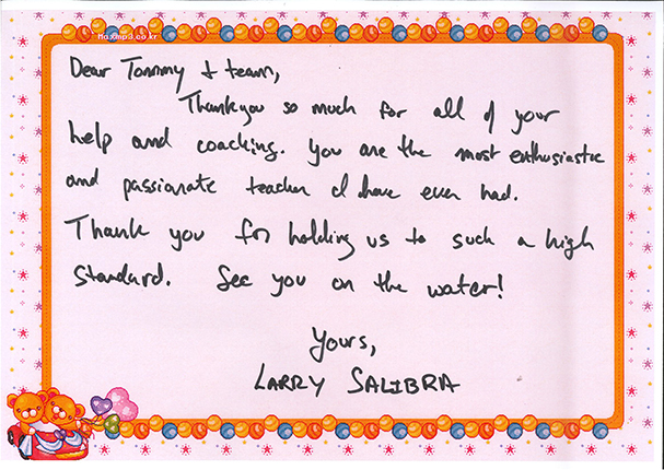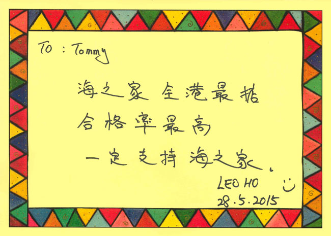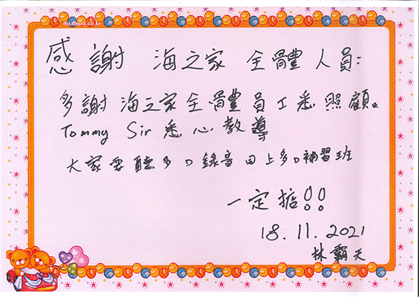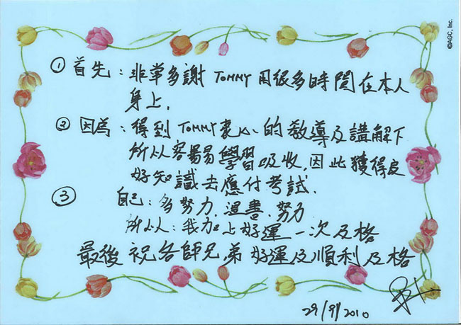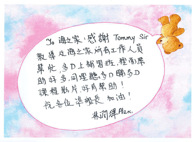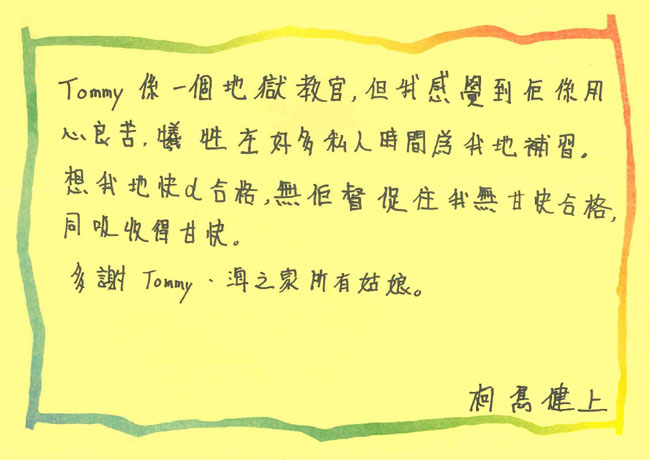 To: 海之家 我誠意感謝Tommy悉心指導,並多謝海之家其他女職員的支持和協助。才可順利通過一級遊艇船主之筆試和口試。 學生謝國泉 |