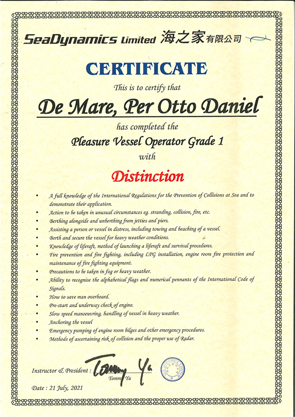 | Mr. Lennox-King Gilbert James..............一級操作人(本地知識)學生 - 可駕駛無限長度及無限馬力遊艇 | ||||||