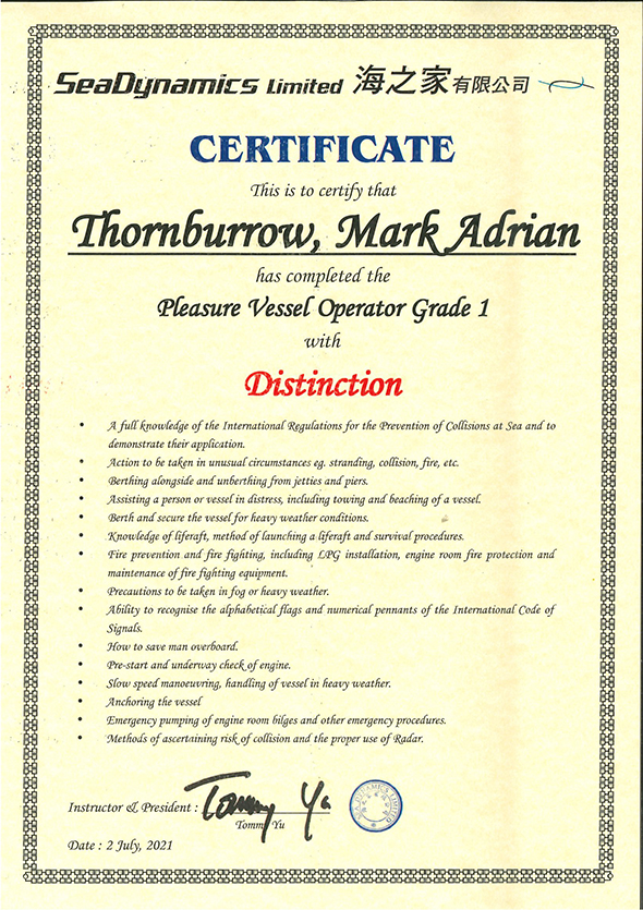 | Mr. Matthew Steven John..............一級操作人學生 - 可駕駛無限長度及無限馬力遊艇 | ||||||