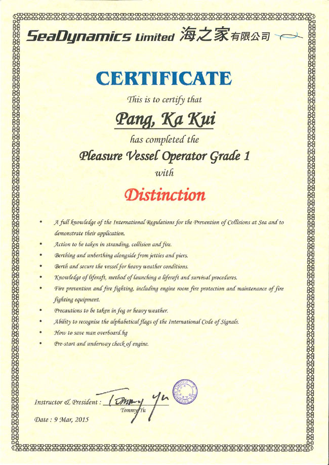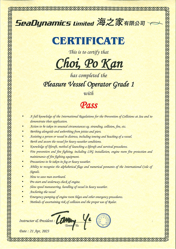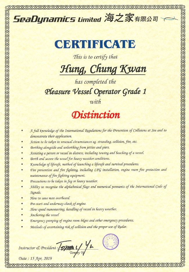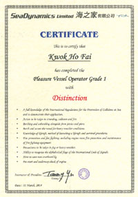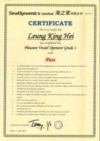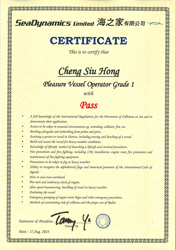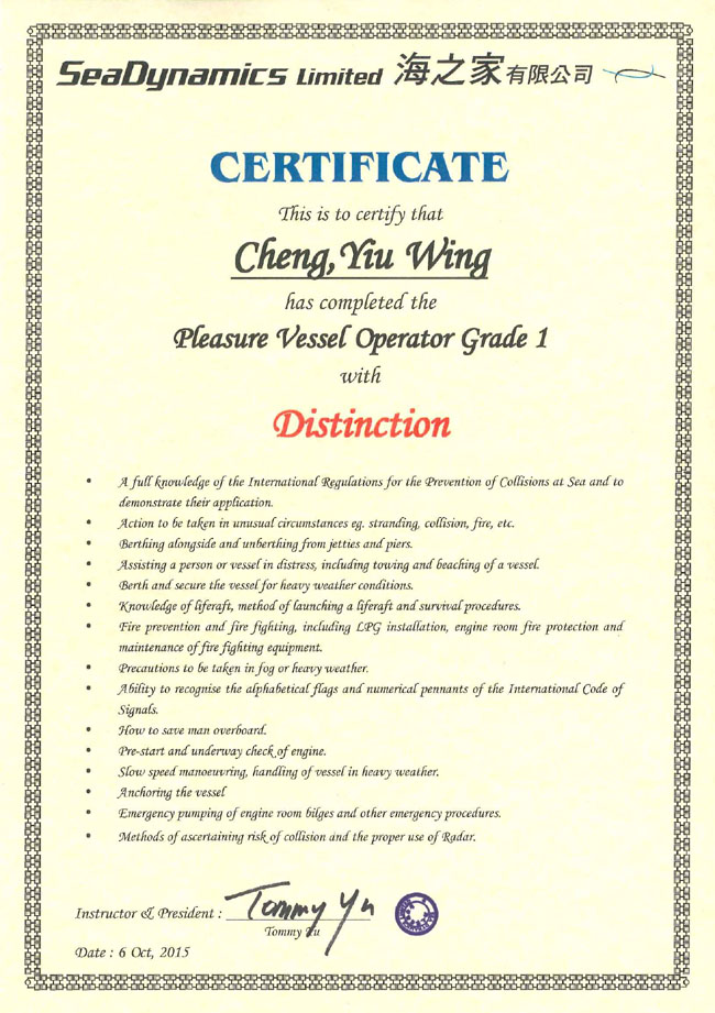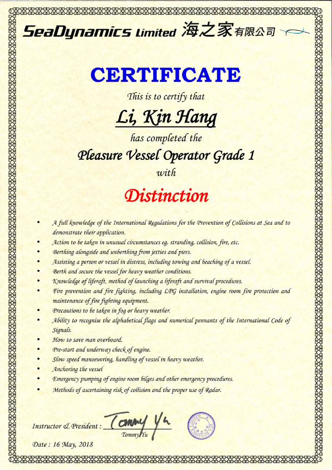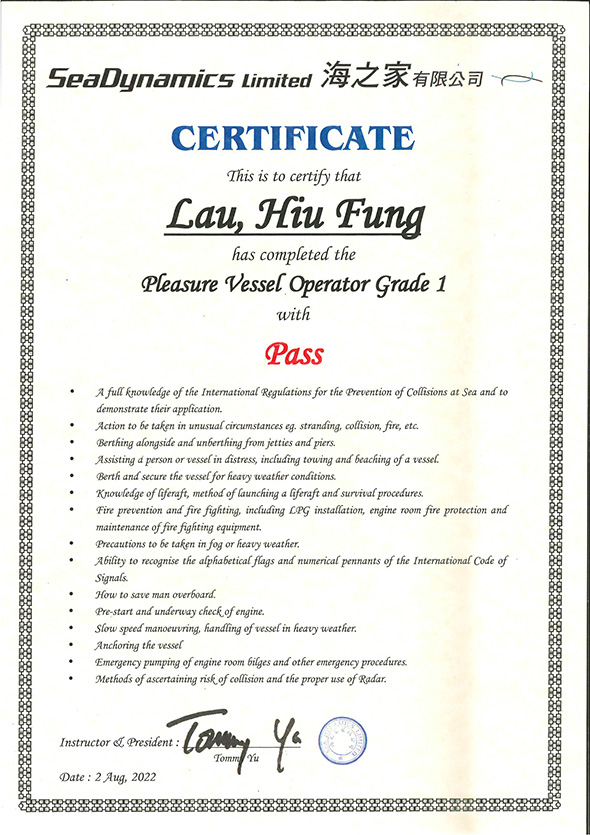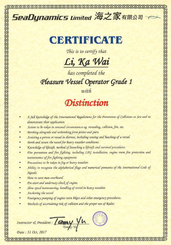 | 黎豪賢先生生生................. 一級操作人學生 - 可駕駛無限長度及無限馬力遊艇 | ||||||