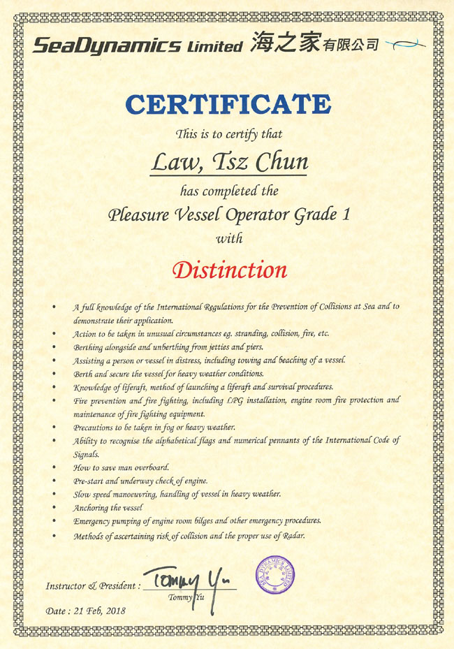 | 羅庭堅先生生生................. 一級操作人學生 - 可駕駛無限長度及無限馬力遊艇 | ||||||